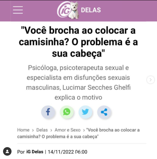 Conheci a Lucimar através da indicação de um Urologista. Meu problema não era comum, ao menos eu achava que não era. Desde sempre tive ejaculação retardada e para mim era impossível chegar ao orgasmo durante uma relação sexual. Chegava a exaustão sempre antes de chegar ao orgasmo. Transar pra mim era frustrante e, por vezes, pra minha namorada também.